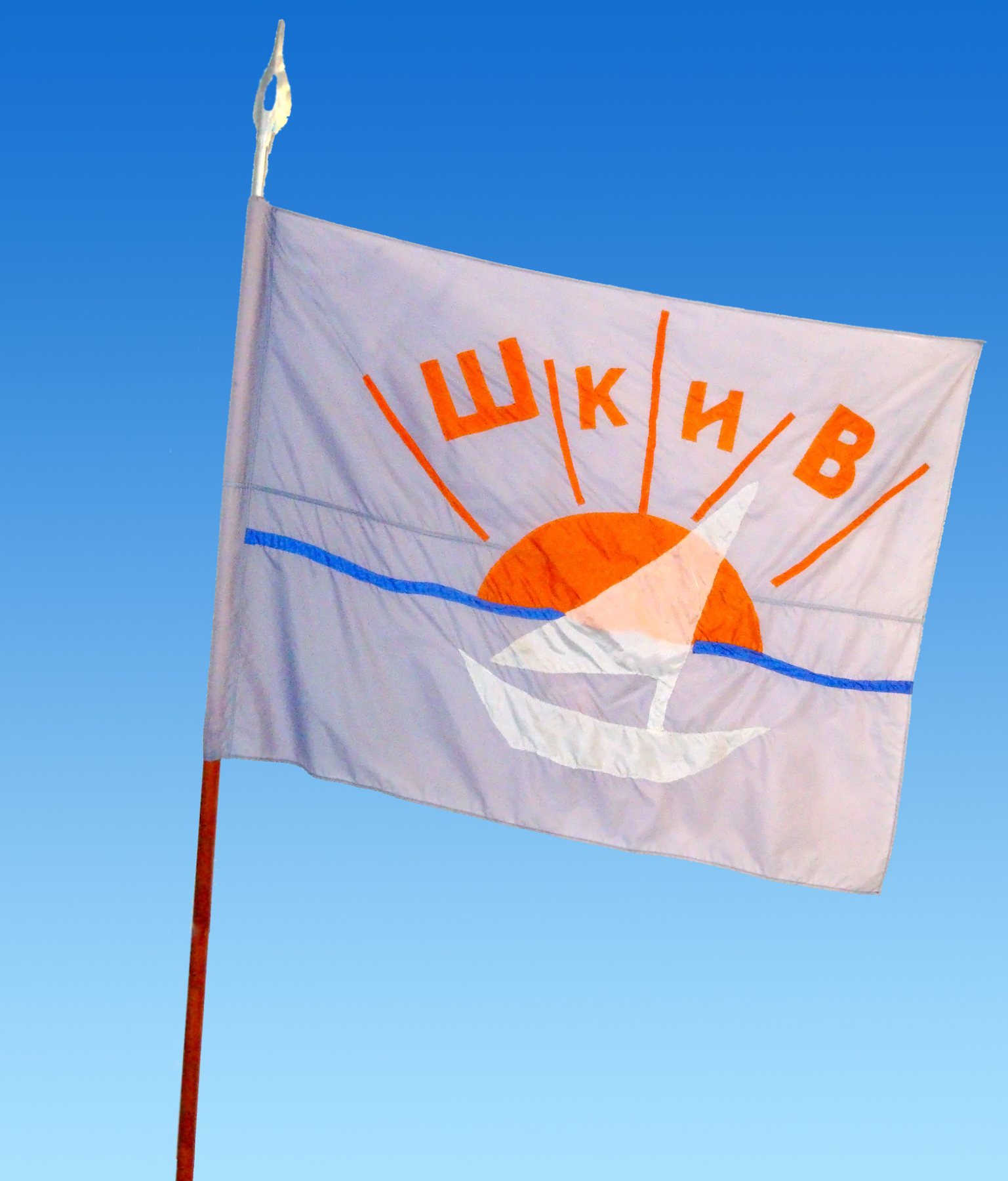 Флаг школы. Флаг школы представляет собой прямоугольное полотнище голубого цвета. В центре, в лучах восходящего оранжевого солнца по морю плывет белый парусник. От диска солнца исходят лучи. Лучи солнца разделяют буквы ШКИВ (Школа имени Виноградова). Линия горизонта выделена темно-синей полосой. Древко знамени увенчано пикой в форме перовой ручки.